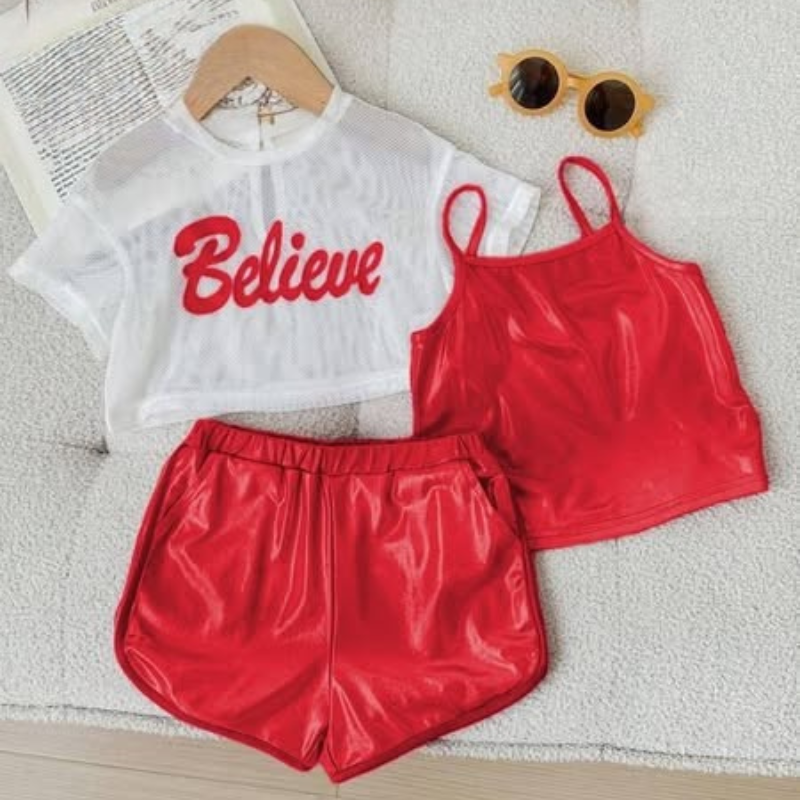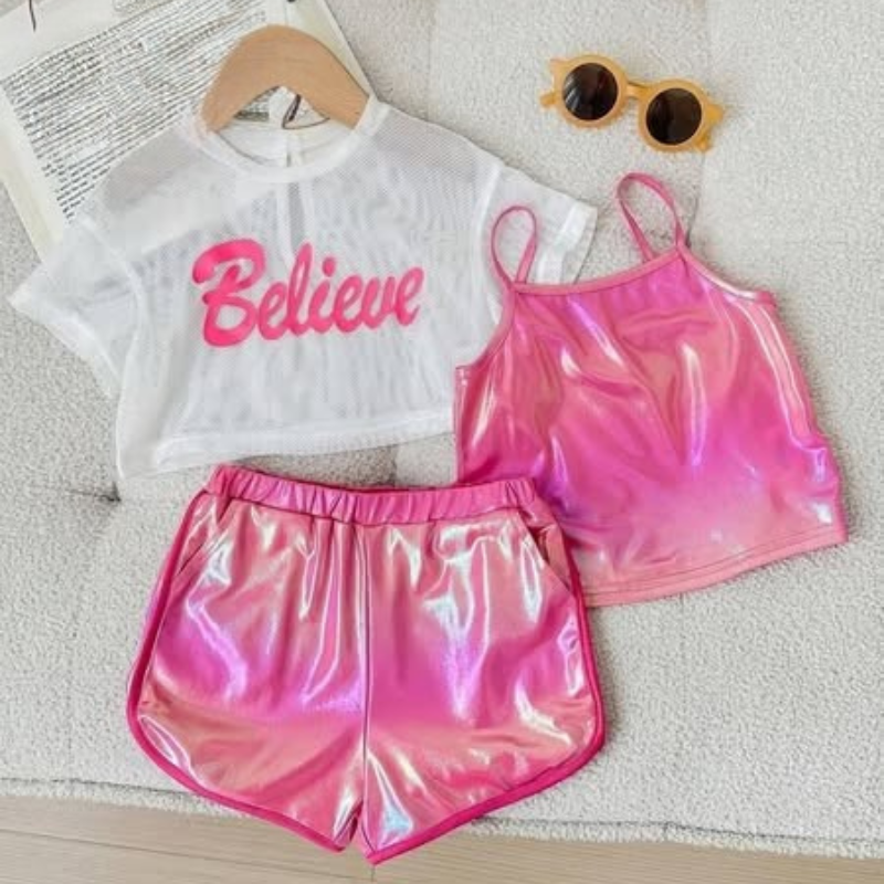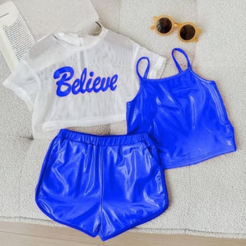 بلوزة تل مطبوعة + توب كت لامع + شورت خامة ديسكو لامعة تناسب الصيف والخروجات والمشاوير.